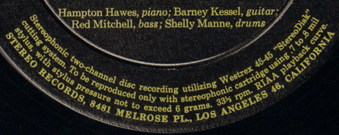 Schwann publications indicates that the "Stereo Records" label was first listed in the January 1959 issue that was available in December 1958 on news stands and in shops. The label was listed as Stereo and in brackets was added 'in stereo only'. Schwann's list of stereo labels can be found on the last pages of the catalog. The releases had references in the 7000 series, the same used by Prestige which could have been somewhat confounding. The recordings appeared on the Contemporary label also but then in mono only. An example is the disc Hampton Hawes: Four! which was released as Contemporary C3553 in January 1959. The stereo edition was available around the same time as STEREO RECORDS S7026. Stereo Records was still listed in the early 1963 catalogs but was soon deleted from the list of record labels when the recordings became available in the Contemporary S7000 Series. Some were newly cut, but a few still had STEREO stamped in the dead wax in a large font.