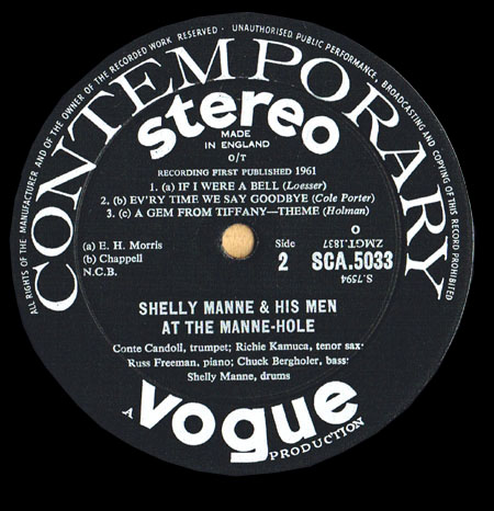 At right the label of one of the records of Shelly Manne and His Men in The Manne Hole released in Great Britain on the Vogue label. Plates and pressings by Decca.